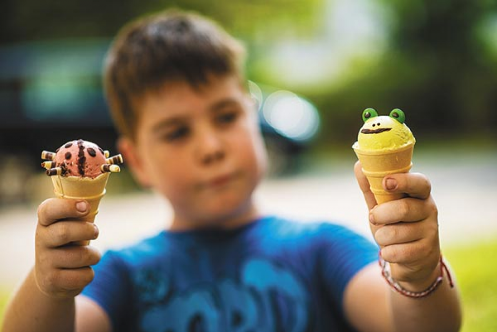 Anyu citromos sörös fagyival hűti magát, bár kacérkodott a madártejessel is, apu hagyománytisztelő, a csoki-vanília vegyest részesíti előnyben, főleg akkor, ha csavaros. Érdeklődve, ugyanakkor kétkedve olvassák a táblácskákon a sajttorta és a lecsó feliratokat. Az energiaitalos nyalánkságról persze lebeszélik a nagylányt, a kicsik viszont megrögzötten ragaszkodnak kedvenceikhez: a Hupikék törpikék- és a Hello Kitty-fagyijukhoz. Bár újabban a hupikék és a rózsaszín édességet időnként felváltja a Minyonok vagy Spongyabob Kockanadrág sárgája. (Mindez persze csokis-kókuszos szélű tölcsérben, a tetején színes cukorkákkal…)