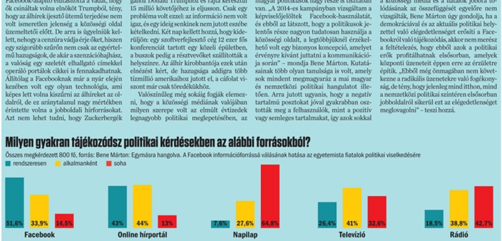 Világszerte 1,8 milliárd felhasználója van a Facebooknak, Magyarországon közel 5,3 millióan regisztráltak, vagyis a felnőtt lakosság jelentős része fent van a közösségi oldalon. Bár konkrét adataink nincsenek arra nézve, hogy ez hogyan befolyásolja a magyarok politikai döntéseit, biztosak lehetünk abban, hogy itthon is nagy hatása van az oldalnak, amely nálunk is piacvezető. A témával az MTA TK Politikatudományi Intézetének tudományos segédmunkatársa, Bene Márton is foglalkozik, aki a Facebook mint információforrás hatását vizsgálta a fiatalok politikai viselkedésére. Kutatásából kiderült, hogy a politika iránt nem érdeklődő egyetemisták elsődleges hírforrása a közösségi oldal, vagyis elsősorban itt találkoznak (akár akaratlanul) közéleti hírekkel, a hírportálok, tévé, rádió vagy éppen a napilapok sokkal ritkábban érik el őket. Ezzel pedig már a magyar politikusok nagy része is tisztában van. „A 2014-es kampányban vizsgáltam a képviselőjelöltek Facebook-használatát, és ebből az látszott, hogy a politikusok jelentős része nagyon tudatosan használja a közösségi oldalt, a legtöbbjüknél érzékelhető volt egy bizonyos koncepció, amelyet érvényre kívánt juttatni a kommunikációja során” – mondja Bene Márton. Kutatásainak több olyan tanulsága is volt, amely sok mindent megmagyaráz a mai magyar és nemzetközi politikai hangulatot illetően.