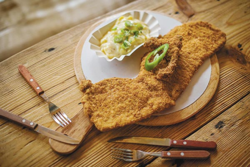 Ami ugye a rántott húsra alapozta létét. Formailag az olasz stílt követi: dupla tenyérnyi szelet papírvékonyra kiverve. Ennek a módinak van létjogosultsága a milánói szelet (klopfolóval alaposan kilapított borjú leheletnyi panírban, mindkét oldala egy-egy percig sütve) esetében, ám a disznóhúsnak halála. Egyrészt a karaj olyan nyúlós-pépes lesz a ritmusos ütlegeléstől, másrészt az ildomtalanul vastag panír megfojtja az ízét.
