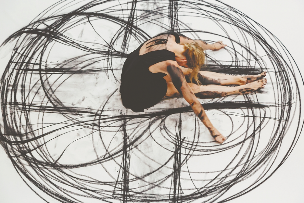 Szénnel keni be a testét, majd egy hatalmas, földre terített papírlapra fekszik és mozogni kezd, mintha csak táncolna, így készít élőben dinamikus és látványos szénrajzokat Heather Hansen New Orleans-i performanszművész.