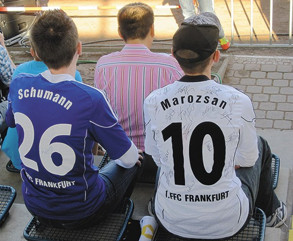 Azt, hogy Németországban imádják a női focit, tudom: néztem a telt házas meccseket a 2011-es, ottani rendezésű világbajnokságon, amikor a hajlakkgyártó cégtől a divatáruüzletig mindenki a válogatott játékosokkal reklámozta magát. Az érdekelt, hogy megy ez a „hétköznapokon”. Leszállok a metróról, és világossá válik, hogy a stadionig csak a Frankfurt- sálas szurkolókat kell követnem (egy órával a meccs előtt már gyülekeznek). Kérdezősködöm: kivétel nélkül imádják Dzsenit. Zászlókat lóbálnak, dobokat cipelnek. Közben fellobogózott busszal érkeznek a Turbine Potsdam szurkolói is. A stadion zsong, a lelátón megannyi Marozsán-mezes drukker. A belépéskor színes programfüzetet és egy német válogatott sálat nyomnak a kezembe. Vannak sajtóhelyek, VIP-ülések, a fotósok egymást tapossák egy jó képért – idehaza NB I-es férfimeccsen sincs ilyen hangulat. A szemközti oldalon az állóhelyek is megtelnek, mire a két szpíker felvezeti a friss bajnok U17-es csapatot. A lányokat rózsával köszöntik. Az ováció csak fokozódik a felnőtt kezdőcsapat bevonulására: szinte hokimeccsen érzem magam. A játék tempója feszes, a 22. percben a Frankfurt megszerzi a vezetést, és mint később kiderül: a győzelmet. A nézőtér – a hivatalos statisztika szerint 3180 fizető szurkoló – tombol. Dzseni szülei az állóhelyekről követik lányuk minden mozzanatát – a többi játékos családja is felfedezhető a sálas-dobos, ugráló tömegben. A lefújás után elindulunk, hogy gratuláljunk a frankfurtiak tízesének.