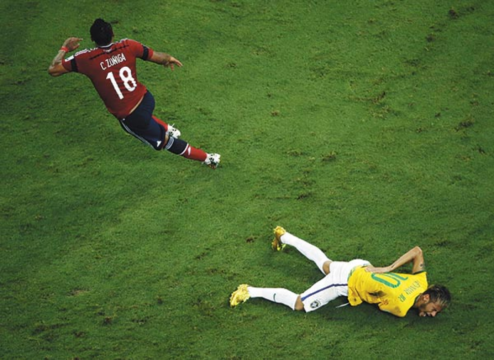 A brazil válogatott orvosa, Rodrigo Lasmar bejelentése szerint Neymarnak eltört a harmadik csigolyája az ágyéki részen, amikor Juan Zuniga a hátába térdelt a 87. percben. Bár műteni nem kell, a felépüléséhez hetek kellenek. A második brazil gólt parádés szabadrúgásból jegyző David Luiz elmondta, az egész csapatot letörte az eset, de Neymarért is küzdenek a továbbiakban. Luíz Felipe Scolari szövetségi kapitány feldúltan nyilatkozott: „Mindenki tudta, hogy rá fognak vadászni, három meccse ez megy. Nem lesz egyszerű a felépülése az alapján, hogy az orvosok szerint milyen fájdalmai vannak. És a vétkes még egy sárga lapot sem kapott, semmit.” Zuniga a történtek kapcsán szombaton annyit mondott: „Nem akartam sérülést okozni neki. Mikor az országodért játszol, egyedül arra gondolsz, hogy meg kell állítanod az ellenfelet!"